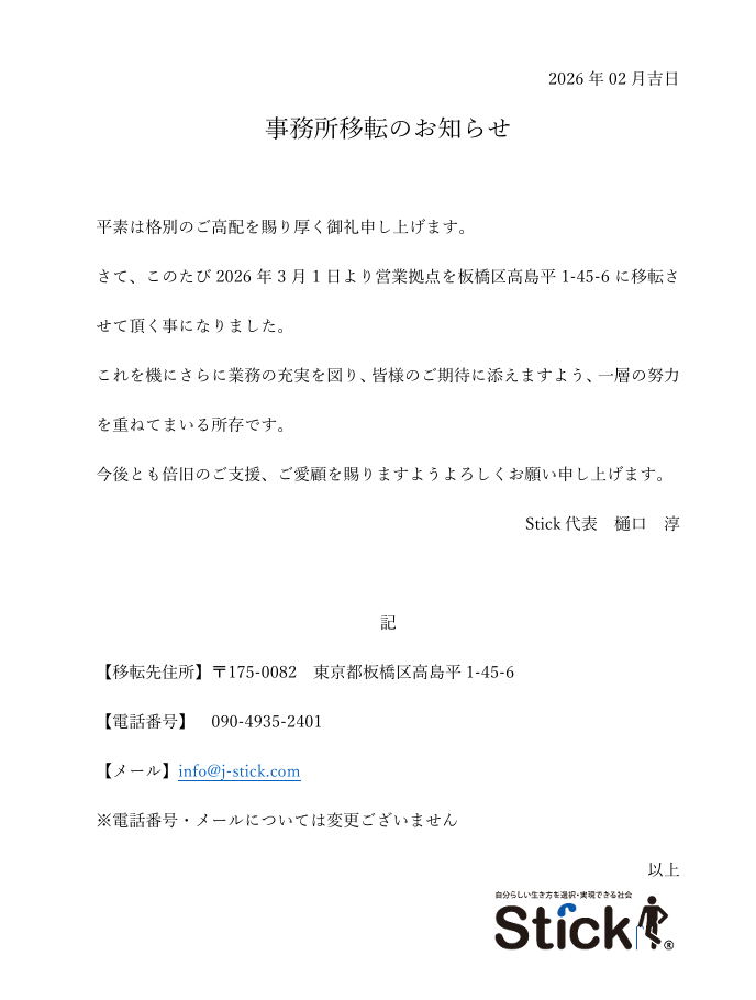 事務所移転のお知らせ(2026年3月1日) 2026 2/22 NEWS Pick up 2026年2月22日 NEWS Pick up URLをコピーしました! 【We♡カラフルいたばし(第17号)】に掲載 関連記事 【We♡カラフルいたばし(第17号)】に掲載 2025年2月14日 【2/9(日)『カイゴフェスタ2025〜フクシのミリョク〜』に参加します!】 2025年2月1日 【ライフキネティック教室@板橋区立体育館】 2024年12月21日 【Stick ロゴ・屋号の商標登録】 2024年12月11日 【陽ちゃん家カフェ:イベントのお知らせ】美濃焼タイルのワークショップ 2024年11月28日 【イベント出演のお知らせ】 『笑顔上尾まつり』 2024年9月20日 【イベント出演のお知らせ@板橋区前野町】 2024年9月20日 【あいサロン×Stick:フレイル予防のための「運動」×「脳トレ」エクササイズ】 2024年6月28日